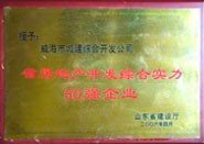 獲獎(jiǎng)名稱:省房地產(chǎn)開(kāi)發(fā)綜合實(shí)力50強(qiáng)企業(yè) 獲獎(jiǎng)單位:威海市城建綜合開(kāi)發(fā)公司 授獎(jiǎng)單位:山東省建設(shè)廳