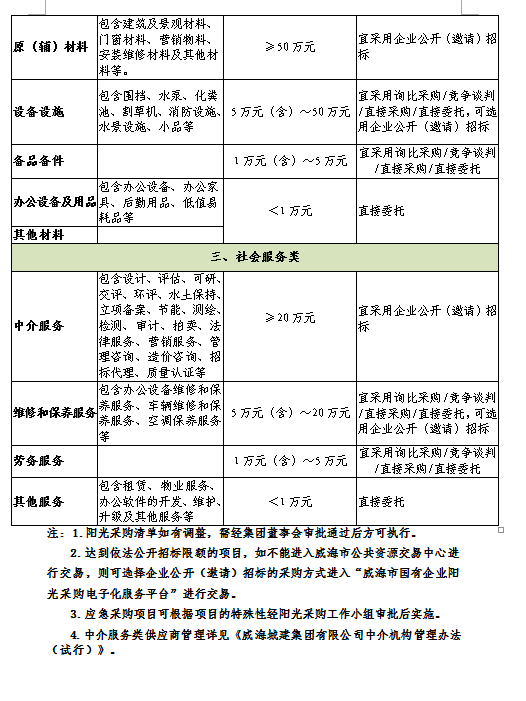 第十七條 本制度規(guī)定的采購(gòu)范圍包括工程建設(shè)項(xiàng)目、物資和社會(huì)服務(wù)的招標(biāo)采購(gòu)(詳見附件一《威海城建集團(tuán)有限公司陽(yáng)光采購(gòu)清單》)。