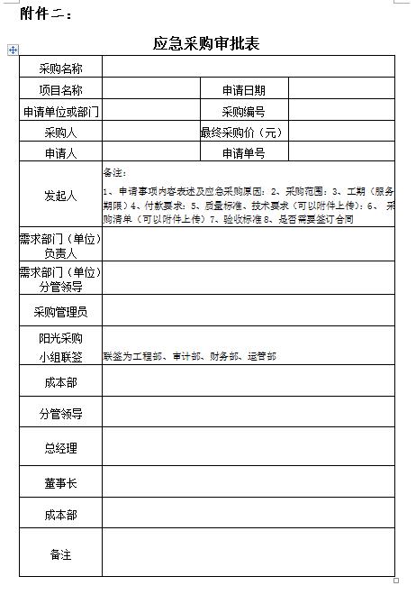 第二十二條 應(yīng)急采購(gòu)經(jīng)需求部門(單位)負(fù)責(zé)人、分管領(lǐng)導(dǎo)、總經(jīng)理同意后由需求部門(單位)直接采購(gòu);事后由需求部門(單位)提交《應(yīng)急采購(gòu)審批表》(詳見附件二),說(shuō)明應(yīng)急采購(gòu)的具體原因經(jīng)評(píng)審?fù)ㄟ^(guò)后,財(cái)務(wù)可直接付款。如果評(píng)審后認(rèn)定該事項(xiàng)不屬于應(yīng)急采購(gòu)的,參照本制度第七章工作紀(jì)律進(jìn)行問(wèn)責(zé)。