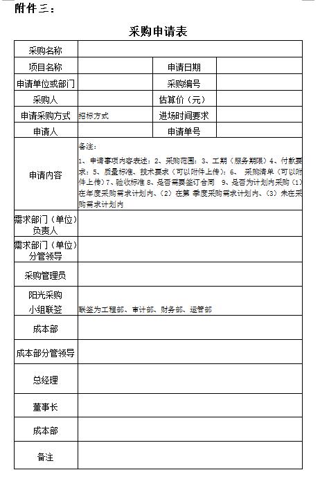 3.工作流程:需求部門(單位)提報(bào)《采購(gòu)申請(qǐng)表》,按規(guī)定程序?qū)徟ㄟ^(guò)后,由成本部委托招標(biāo)代理機(jī)構(gòu)具體實(shí)施。