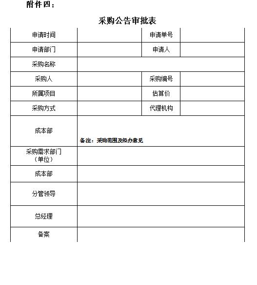2.成本部或需求部門(單位)負(fù)責(zé)按照批準(zhǔn)的《采購(gòu)申請(qǐng)表》,委托招標(biāo)代理機(jī)構(gòu)組織或自行組織詢比,編制采購(gòu)文件,根據(jù)需要可以發(fā)起《采購(gòu)公告審批表》或《采購(gòu)文件審批表》;